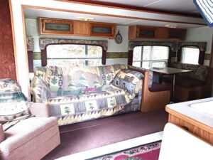 Rooster Ridge RV A Country RV Getaway at WagonMaster Ranch Bedroom with Queen Bed Foldout Couch Shower Kitchen Wi-Fi ROKU Pet Friendly Overview Rates Availability