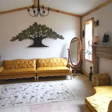 This 2000 sq ft building maintains our overall rustic homestyle ambiance intertwined with elegant comfort for small or large informal or formal events. The full kitchen allows for self preparation, select our recommended caterers, or bring the caterer of your choice. Our beautiful Bella Room allows for an intimate private drawing room, tea parties, or bridal dressing area. The building can accommodate 125 guests using our covered porches. We can accommodate more using the beautiful outside acreage and canopy as well. We have many supplies at your disposal such as outside & inside decor, serving dishes and tableware, table & chairs. Our outdoor wedding or party areas are available with shady trees and arbors by the pond. Arbors and pews have been made from our milled wood. Our comfortable wagon can bring the bride or wedding party to the arbors for the ceremony. With our on-site lodging, you can make it a weekend event.