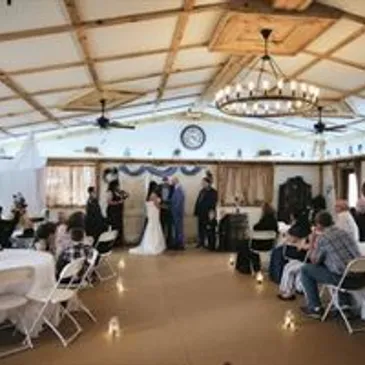 The outdoor wedding venue includes a beautiful pond site with pews and lighted arbors made from our own trees by the pond. Add our twinkling lights for extra ambiance.