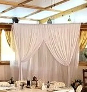 Use your own backdrop like the pictured couple or use our lighted corner and toulle for the ceremony or cake. We also offer an aisle runner, lanterns, and other decor.